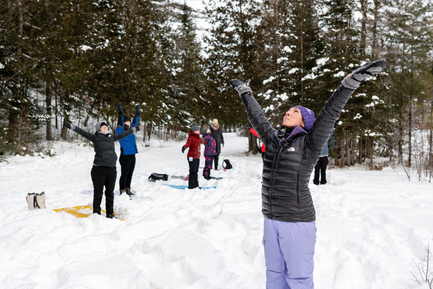 L’aventure commence par une marche à rythme lent à modéré sur des sentiers accessibles à tous, que tu sois en bottes d’hiver ou en raquettes (selon les conditions). Ensuite, une séance de yoga-neige, pensée pour étirer tout le corps et garder au chaud, te sera proposé.